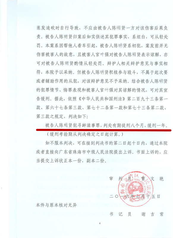 最后,珠海市金湾区人民法院采纳了本律师团队的辩护意见,于7月15日作出“陈某某犯寻衅滋事罪,判处有期徒刑八个月,缓刑一年”的判决。判决当日,陈某某获得了人身自由。刚获自由,陈某某立即打电话告知其辩护律师,对律师的感激之情溢于言表。